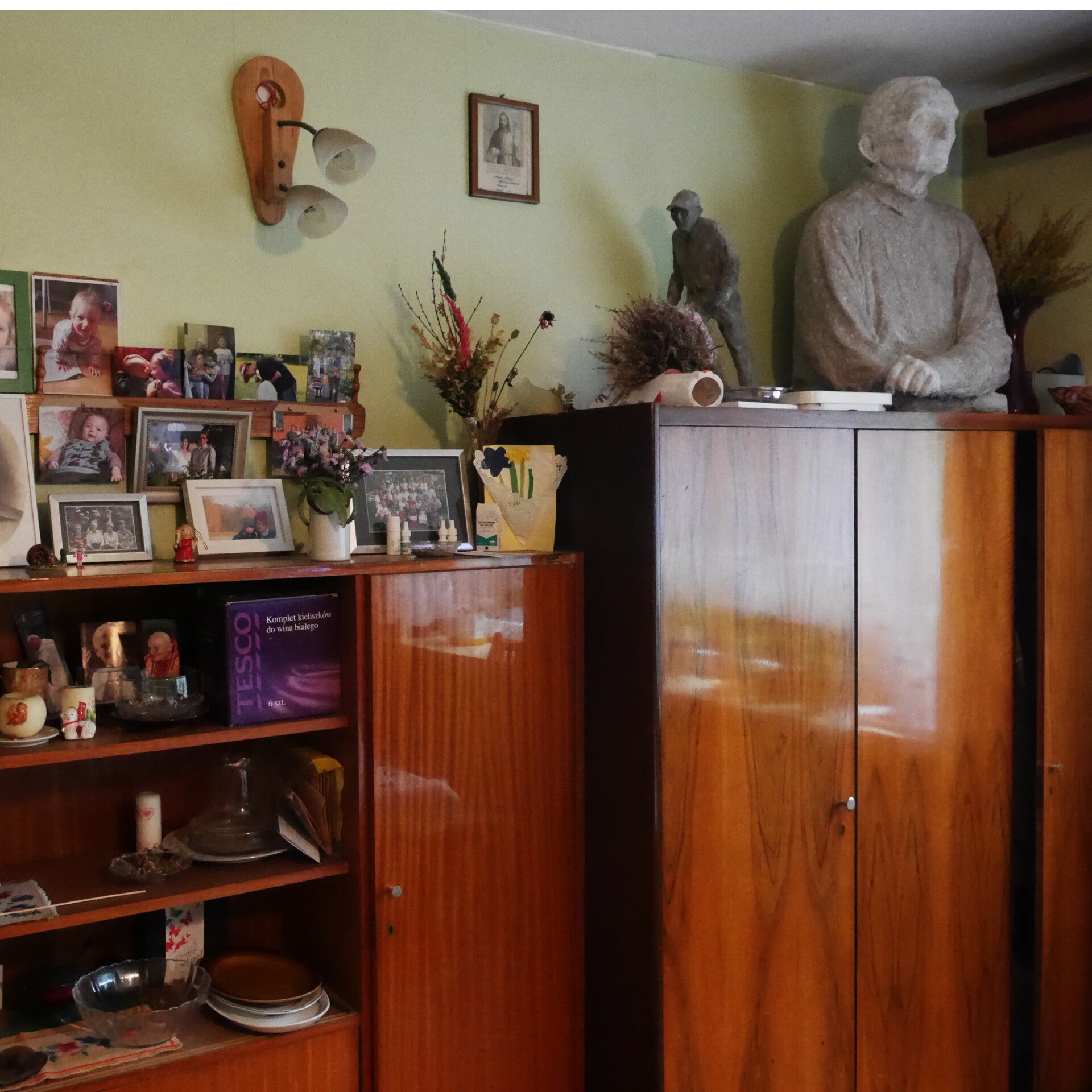 Portret dziadka to praca składająca się z klasycznego portretu rzeźbiarskiego, instalacji oraz filmu. Jest to opowieść o niezwykłym człowieku, który jest wynalazcą amatorem, emerytowanym kolejarzem, mężem, ojcem i dziadkiem. Potrzeba stworzenia tego portretu wyniknęła z mojej fascynacji osobą dziadka oraz jego twórczością. Bardzo ważny jest dla mnie w tym przypadku archiwizacyjny charakter pracy: to, co prezentuję widzowi, nie obejmuje setek powstałych zdjęć oraz kilkunastogodzinnych nagrań wspomnień. Jest to rozszerzenie rodzinnego albumu o nową wartość. Podjęcie tego tematu wynika również z chęci budowania głębszych relacji z bliską mi osobą, poświęcenia jej czasu i uwagi.